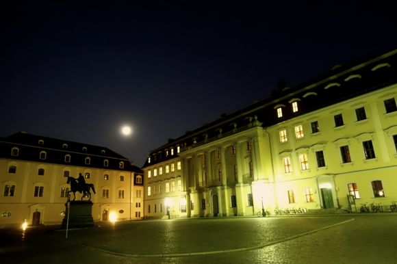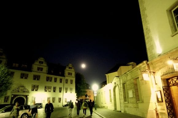 當天我們抵達威瑪已是傍晚時分,見民主廣場挺立著熱愛運動、狩獵的卡爾.奧古斯特公爵騎馬雕像。在威瑪市政廳地下室的地窖餐廳用過晚餐後,走回廣場的路上,抬頭驚見那像兩百多年前的圓月,曇花般綻開威瑪漆黑的夜空!