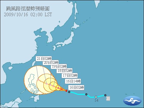 右圖:第20號輕度颱風盧碧凌晨2時形成,是否侵襲台灣仍待觀察。(圖為盧碧的路徑潛勢預報圖,取材自中央氣象局官網www.cwb.gov.tw)