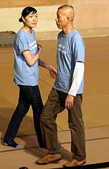 (右圖:爆破藝術家蔡國強(右)18日在華山創意文化園區,創作爆破藝術「晝夜」,馬總統的小女兒馬元中(左),輕便裝扮擔任助理進行事前準備。)