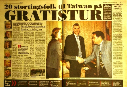 據記者楊森(Marianne Johansen)女士連日查訪,前後共有20名挪威議員接受「台灣當局」(報紙用詞)支付機票和吃住,顯然有違「挪威社會道德標準」。舉凡挪威保守黨主席、進步黨副主席和多位前內閣閣員等有頭有臉政壇人士,都曾是台灣政府座上賓。因此這20筆「疑雲重重」的交易,自然有必要公諸於世。