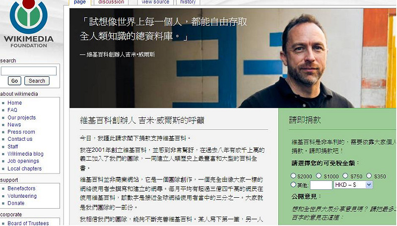 今日,我謹此請求閣下捐款支持維基百科。我在2001年創立維基百科,並感到非常驚訝,在過去八年有成千上萬的義工加入了我們的團隊,一同建立人類歷史上最豐富和大型的百科全書。