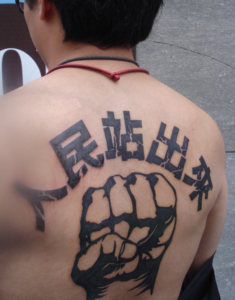 堅決反美牛台大博士生朱政騏為抗議此附帶決議並未通過,在立院門口脫去上衣,在背後刺上「人民站出來」5個大字及拳頭圖樣,以行動表達反美牛決心。