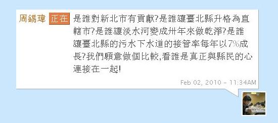 周錫瑋是在上午11點34分發噗:「是誰對新北市有貢獻?是誰讓臺北縣升格為直轄市?是誰讓淡水河變成卅年來做乾淨?是誰讓臺北縣的污水下水道的接管率每年以7%成長?」