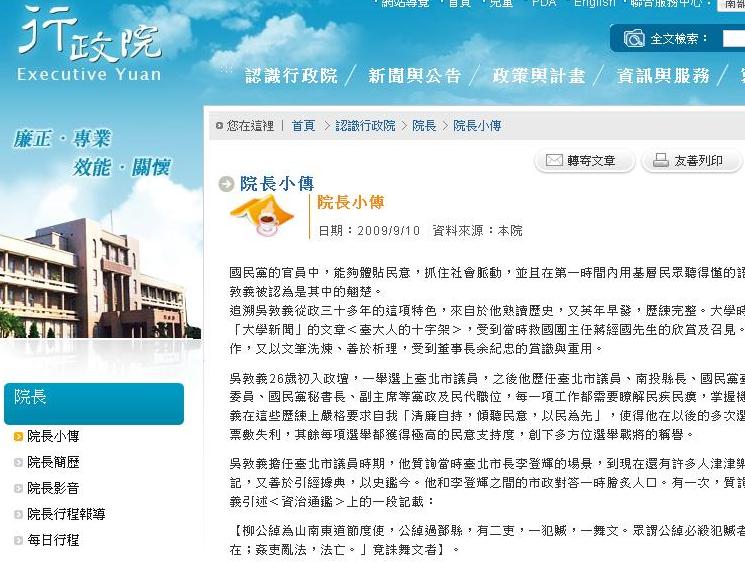 這篇「院長小傳」張貼在行政院官網(http://www.ey.gov.tw/ct.asp?xItem=59763&CtNode=1257&mp=1),張貼日期是去(98)年9月10日,也就是吳揆上任當天,資料來源註記「行政院」。