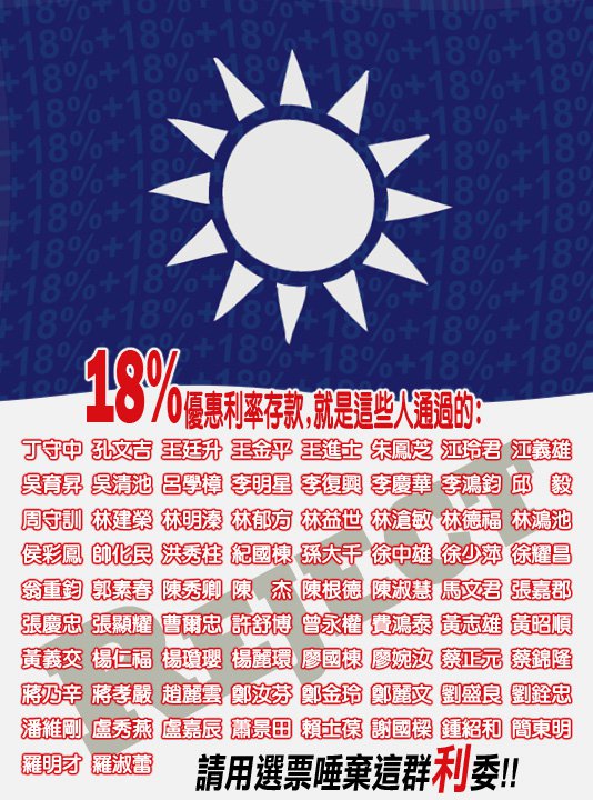 因此,今天遭點名的都是立院現任會期的74位藍委,網友PO文指出,現在引發輿論批評、市井小民震怒的「18%優惠存款利率就是這些人通過的,年底立委選舉時,請記住這些人,用選票淘汰他們。」