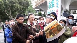 影片說明:昨天的行動劇由志工戴上面具扮演林國棟,並舉起斧頭,砍向掛著「護樹有罪?」枷鎖的潘翰疆。主持人潘翰聲說,林國棟砍樹有功,所以榮登斧頭幫幫主,祝賀他升官發財,以諷刺警方球員兼裁判的荒謬。現場並高喊護樹無罪、林國棟下台等口號。