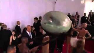 繼去年轟動一時的「生牛肉」裝後,卡卡的搞怪細胞再次作祟,這回則是躲在一顆半透明的蛋中,由數名穿金衣的隨從扛著,一踏入會場就引來歌迷陣陣驚呼。不知道是想製造話題,還是怕悶死自己,蛋的後端竟然還開了一個洞,卡卡也不時地將手伸出洞口,向歌迷打招呼。