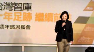 台灣智庫創立於2001年,是民進黨執政後成立最久的智庫,並歷經政黨二次輪替的重大變動。昨天舉行成立十年來的第一次募款餐會。蔡英文表示,智庫雖然是比較接近民進黨的,但不僅曾提供許多免費的建言,而且也對於過去的執政過程提出批評,對民進黨貢獻很大。