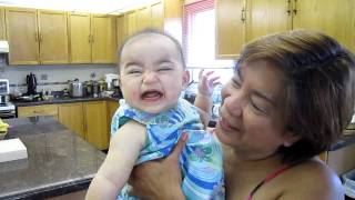 影片中,6月大的菲律賓女嬰Kalia寶寶,在祖母的懷抱中眼睛睜得大大,表情看似帶了點驚恐,這時旁邊的人興奮地開口對Kalia喊著:「微笑、微笑!」,想不到Kalia聽了之後居然用力眼睛一瞇,嘴巴睜大,露出了不像一般嬰兒微笑的複雜的表情。