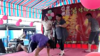 婚禮宴客時,配合著喜氣洋洋的幸福氛圍,讓人忍不住想高歌一曲,更性情中人一點,還會和著歌聲伴舞,不過影片中這名男子,不知是喝醉,還是舞蹈細胞被激發,上台隨著音樂節奏手舞足蹈、扭腰劈腿樣樣來,甚至還來個後空翻,卻失敗頭部著地,差點樂極生悲。
