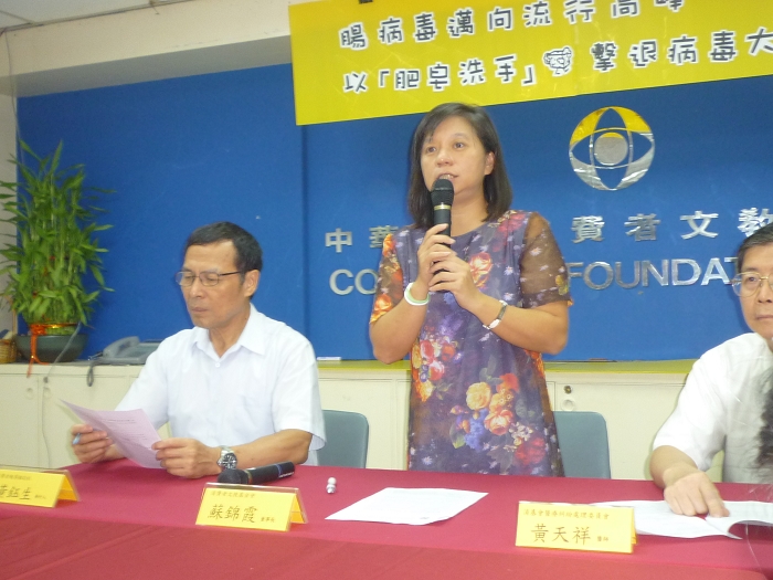 消費者文教基金會今(4)日下午召開記者會,宣導民眾正確洗手觀念,以對抗時下正邁入高峰的腸病毒。消基會醫療糾紛處理委員會醫師黃天祥指出,目前許多公共場合會提供民眾酒精乾洗手的服務,雖然方便,但用來對抗腸病毒其實沒有什麼作用;黃天祥呼籲民眾,用肥皂水來洗手,其實就可以達到很大的除菌效果。