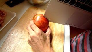 影片中,沾板上放著一顆蘋果,但沒想到用來切蘋果的並不是一般常見的水果刀,而是一台蘋果公司推出的筆記型電腦MacBook Air。只見網友將這台以輕薄著名的筆電放在蘋果上,稍加使力,鮮紅的蘋果還真的被切出一條裂縫來。