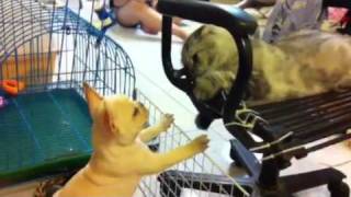 影片中,趴在椅子上的小貓居高臨下,輕輕鬆鬆地壓制小狗的攻勢,任小狗不管怎麼費力地向上撲、咬,就是拿小貓沒辦法,因為小狗只要一靠近小貓,小貓就會毫不留情地使出「連環巴掌」,盡情地「巴」小狗的頭,讓小狗無從招架,惱羞成怒的小狗即使哇哇大叫,還是無法扭轉局勢,模樣相當地可愛。