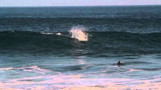 衝浪客趴在衝浪板上,屏氣凝神就為了等待許久的大浪,在加州橙縣新港灘的著名衝浪點「the Wedge」,總是能看到這番光景。在影片中,衝浪客們也與平時一樣等待著浪潮,但這次的大浪特別不一樣,因為居然有一隻身手矯健的海豚隱身在裡頭,在大浪裡頭不斷跳躍,看起來似乎在和衝浪客們共享征服海浪的樂趣。