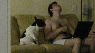 影片中,可愛的黑白鬥牛犬坐在沙發上動也不動的盯著打著赤膊的主人看,突然,主人開始一面搖擺著頭,一面用眼神對狗兒示意,沒想到這隻鬥牛犬居然也化身成「搖頭犬」,有樣學樣的跟著主人的動作左右搖擺起來,動作雖然看起來有些笨拙卻十分可愛。