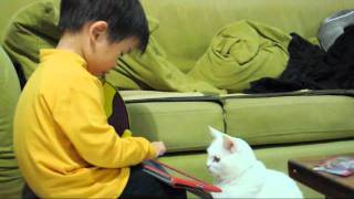 在一般人印象中,可愛的貓咪應該是不會玩iPad2的吧?沒想到,這隻可愛的純白色貓咪「奶茶」,乖乖的在一旁排隊,彷彿是在等待小主人玩遊戲告一段落後,也能輪到牠玩。