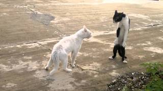 這是醉拳?還是蛇拳?網路上最近流傳一部記錄兩隻貓咪對峙過程的影片,面對白貓主動挑釁,最後黑白貓身子一抖,威風地站了起來,而影片就在這裡結束,時間只有15秒。緊湊的情節,讓網友不禁追問「接下來到底是誰贏了?」