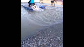 影片中,一輛經過改造的機車,兩旁各懸掛了一排水箱做為提供浮力用,機車不但能在路上行駛,下了水,更搖身一變成為一台水上機車。機車兩旁的水箱高度看來是經過精心設計,才能讓車子在洪水中行駛無虞,不會有引擎熄火的問題。