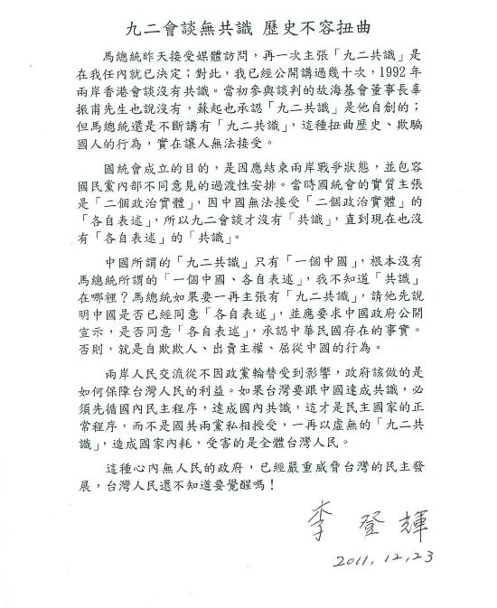 李登輝說,中國所謂的「九二共識」只有「一個中國」,根本沒有馬總統所謂的「一個中國、各自表述」,不知道「共識」在哪裡?馬總統如果要一再主張有「九二共識」,請他先說明中國是否已經同意「各自表述」,並應要求中國政府公開宣示,是否同意「各自表述」,承認中華民國存在的事實。否則,就是自欺欺人、出賣主權、屈從中國的行為。