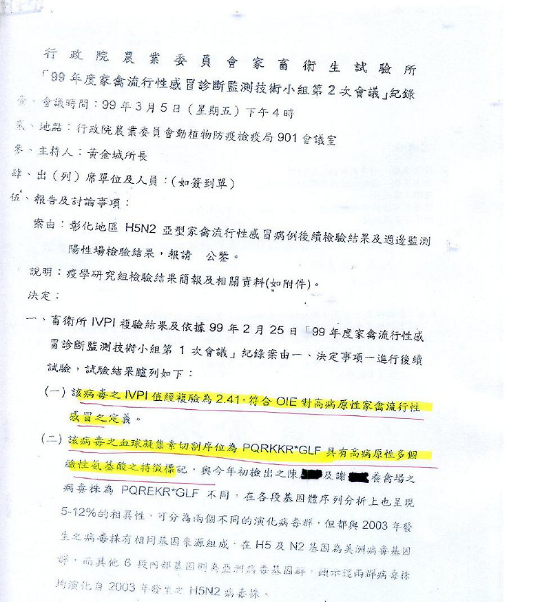 動物研究會也在記者會上提供兩份公文,內容顯示,民國99年3月1日及8日防檢局的內部文件指出,彰化某養雞場已查驗出致病性指數(IVPI)值已達到2.41,且鹼性氨基酸序位皆符合OIE所認定之「高病原性家禽性流行性感冒」的定義。但防檢局仍於1月至4月連續4次向OIE通報為低病原性禽流感病例。