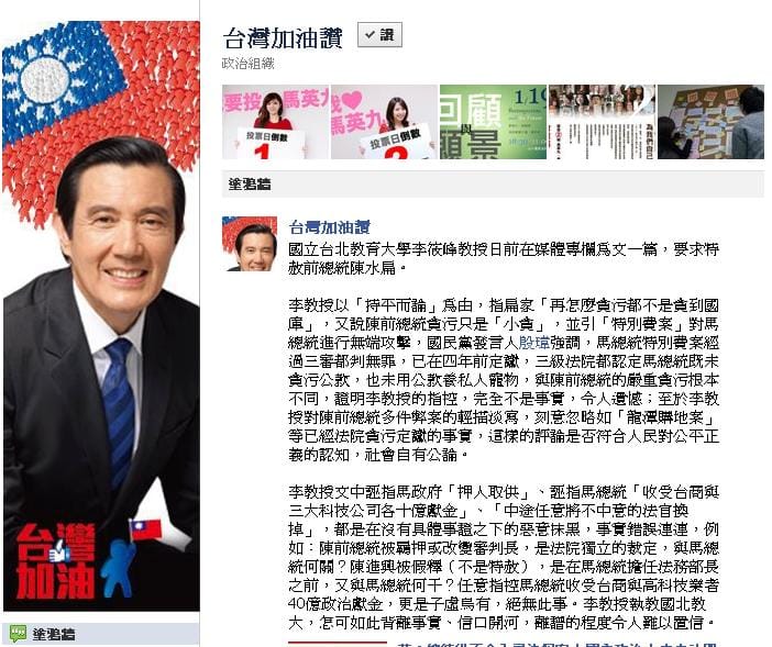 「台灣加油讚」臉書今(12)日進一步PO文反擊,指李筱峰引「特別費」、「收受台商與三大科技公司各十億獻金」以及「中途任意將不中意的法官換掉」等案件事由,都是子虛烏有,對照其評價陳水扁只是「小貪」,社會自有公論。