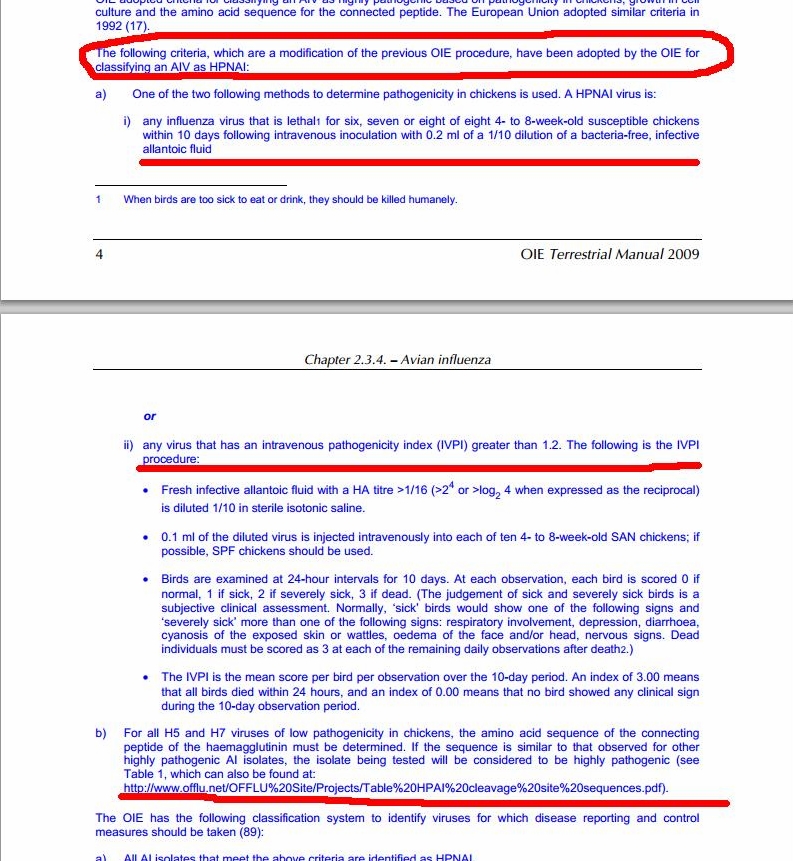 不過,根據OIE的官網所提供的「動物診斷試驗及疫苗手冊」中,刊載了2009年5月核定通過的禽流感定義,內容提到原本高病原性禽流感的判斷標準內,也包括雞隻死亡率須超過75%,但自從1983年賓州發生因低死亡率而判定為低病原性的案例,卻在六個月後突變為死亡率超過9成的狀況後,即認定臨床狀況並不可靠,並於1992年修訂判定方法,改由IVPI值及胺基酸序列等數據來判別,手冊也標明歐盟於1992年採納此方法。顯然政府聲稱依照國際標準的說法和這項規定有所背離。