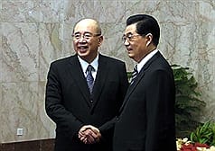 這場會見下午四時於北京人民大會堂福建廳舉行,吳伯雄首先代表國民黨主席馬英九向胡錦濤致問候之意。對於近日民進黨發言人羅致政以學者身份訪中,吳伯雄強調,國民黨樂於看到其他黨派人士到大陸交流參訪,增進彼此的了解,這也有助於台灣內部分歧縮小,建立共識。
