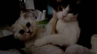 影片中,貓咪們互不相讓,把對方的臉「舔」得不可開交,最後,掛著頸鍊鈴鐺的白色貓咪成功達陣,搶得主人大腿的寶座。有網友認為,乍看之下,牠們不像是在吵架,反倒是相親相愛、你儂我儂,不過,花色貓咪愛過頭了,一不小心就掉到地上。
