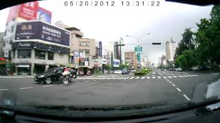在這段由行車紀錄器紀錄的影片中,身穿黑衣的女騎士眼見燈號即將轉變,於是油門一催,闖過紅燈騎在車流眾多的民生路口;這時,只見一台黑色轎車將車行駛在公車專用道上,想要趕在黃燈前通過號誌,在轎車駕駛加足油門往前衝、也沒有發現機車騎士的情況下,轎車直接攔腰撞上了女騎士,機車不但當場粉碎,這名女子也隨著強大的撞擊力飛了數公尺之遠。