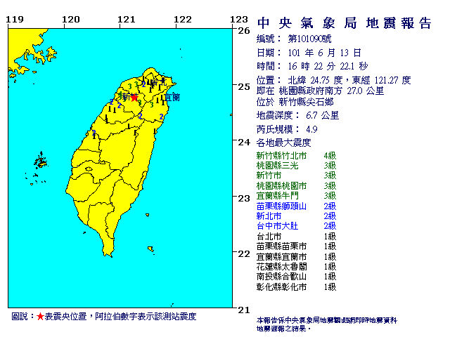 根據數據,各地最大震度分別為新竹4級;桃園縣、宜蘭縣3級;新北市、苗栗縣、台中市2級;台北市、花蓮縣、南投縣、彰化縣1級。