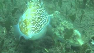 影片是1隻公烏賊身軀呈現雙色,迎接左邊游來的母烏賊。另1隻公烏賊在牠右邊,但沒有在鏡頭內。