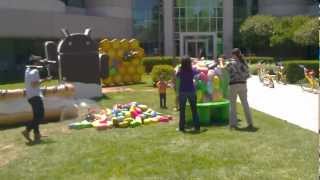 影片內容為Google在6月底架設雷根糖機器人的畫面,透過影片可看到所有以甜點命名的Android各代模型皆位於此處。目前此雷根糖的位置僅剩施工用三角椎及布條,機器人則已送修。