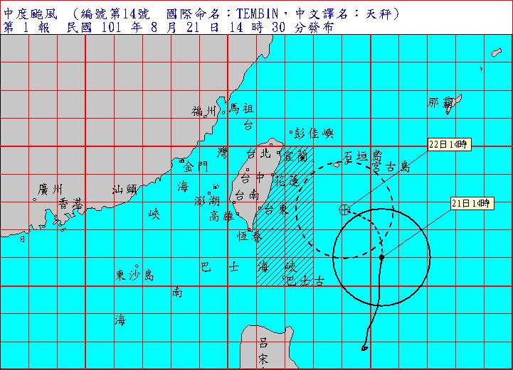 中央氣象局今(21)日下午兩點半針對中颱天秤發布海上颱風警報,中颱天秤目前中心位置在鵝鑾鼻東南東方約470公里的海面上,以每小時11公里速度,往北北西轉西北西朝巴士海峽前進。氣象局表示,天秤強度在中度颱風的範圍內接近強颱,但增強空間有限,從明(22)日開始東部會有陸續降雨,稍晚北部才會有降雨的情形,而天秤最接近台灣的時間是在23日,影響最明顯將是23日整天至24號上半日,陸上颱風警報有可能在明日上午至中午發佈。