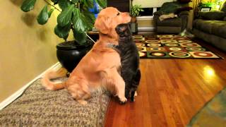 一般總認為狗比較熱情,而貓比較不會表露情感。但影片中這隻熱情的貓咪突然站起來抱住家中另一隻黃金獵犬,並在懷中盡情撒嬌。而黃金獵犬雖然一開始被嚇到,但是當貓咪抱完黃金獵犬後坐在地上,狗狗便伸出前腳拍拍貓咪的頭,彷彿在哄著貓咪說「好乖好乖。」