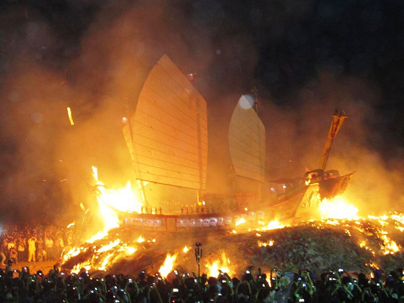 王船引燃,象徵代天巡狩王爺已將境內的厄運、瘟煞帶走,凌空遊天河上繳玉旨,現場除了全面熄燈外,各角頭轎班及陣頭則「偃旗息鼓」自行離開,圍觀群眾也逐漸散去,三年一科的迎王祭典圓滿落幕。