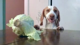 這支叫Maymo的狗,在餐桌旁奮力一跳,就想咬一口眼前鮮綠的高麗菜。而大嚼特嚼新鮮的菜葉還不夠,最後Maymo努力將高麗菜拉向桌邊。影片最後,則是Maymo頭頂高麗菜的殘骸,一臉無辜的盯著鏡頭。