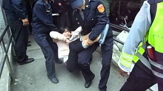 大約在2時左右,最後1位環評委員趕到現場,主席宣布開會,不過,這時場外反對美麗灣的青年自窗戶衝入現場,引發現場騷動。反對人士因此高呼口號試圖阻止會議,但遭到警方拉扯驅離,場面火爆。