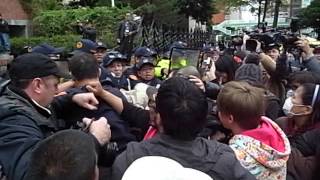由於農委會遲遲不派官員出面接受陳情,眾人在高雄市關懷流浪動物協會理事長王小華的帶領下,開始衝撞警方設置的圍欄試圖衝進農委會,遭到警方推擠制止,雙方推擠將近10分鐘民眾才停止動作,過程中,警方帶走1名男性及1名女性民眾,動保人士因此要求警方放人,最後僵持20分鐘後,終於放人。