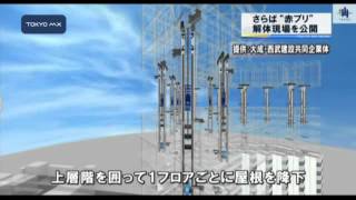 影片2為富士電視台報導,拆除內部工法大公開。位處都心、無法以傳統工法爆破等方式拆除的「赤王子」,使用千斤頂先撐住樓層,由低樓層往高樓層慢慢拆除,一次工程時間3小時可以拆除2層樓,與向來常用的拆除工法相比,可大幅減少粉塵、噪音、震動等對周圍環境的影響。拆除下來的廢材還可再回收利用於發電、照明使用。