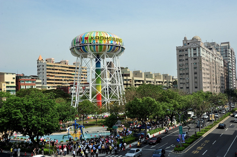 高雄市自來水公園水塔綵繪上粧,有如裹上繽紛糖衣的棒棒糖,市長陳菊表示,塔上彩虹線條繽紛熱鬧,象徵熱情活力的陽光高雄,令人驚豔,變妝的塔身融入19處港都代表性景點地標,為城市觀光魅力加分。