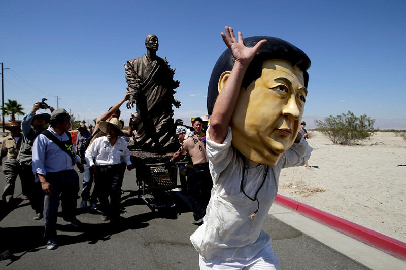 位於加州沙漠中的安納伯格莊園外,戒備森嚴,歐習會在此舉行兩天會議。但場外有反對中國統治的西藏抗議者高喊要中國滾出西藏的口號,一名抗議者頭戴貌似中國領導人的面具。當天晚上他們還會在那裏舉行燭光守夜活動。抗議人群中也有越南抗議者。