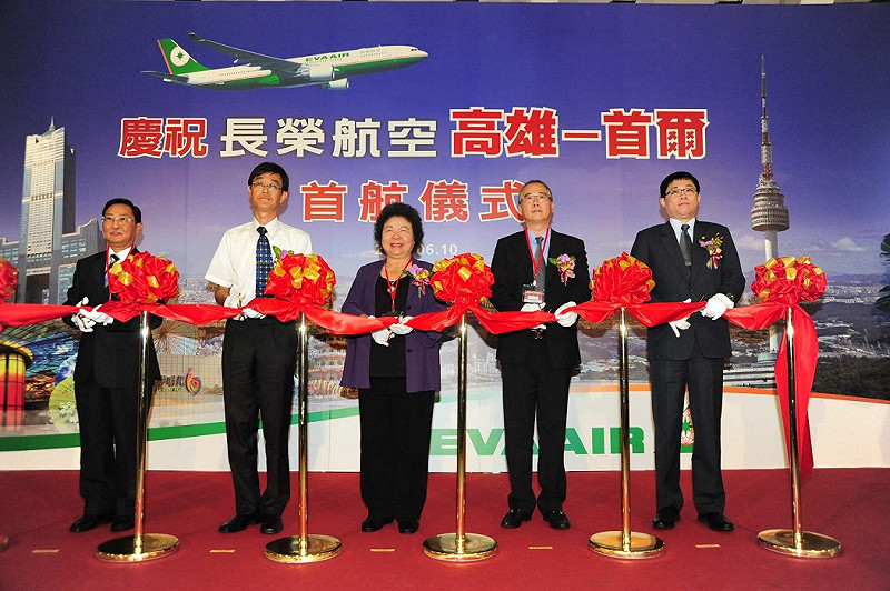 長榮航空新闢高雄直飛首爾定期航線,今天首航飛機下午4點20分正式起飛,不少南部旅客搶搭首班直達班機,市長陳菊、長榮航空董事長張國煒、高雄航空站副主任孫翼中、高雄市旅行同業公會理事長沈本立、高雄市貨運同業公會理事長鄭豐堯等人都到場剪綵慶賀。