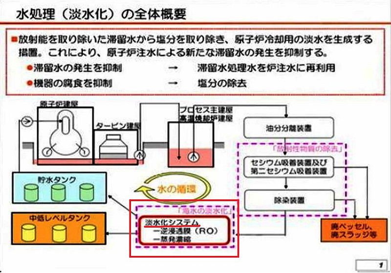 發現漏水的淡水化裝置,是將去除銫(Cs)等放射性元素之後的汙染水,透過逆滲透膜的使用,除去鹽分的設備。