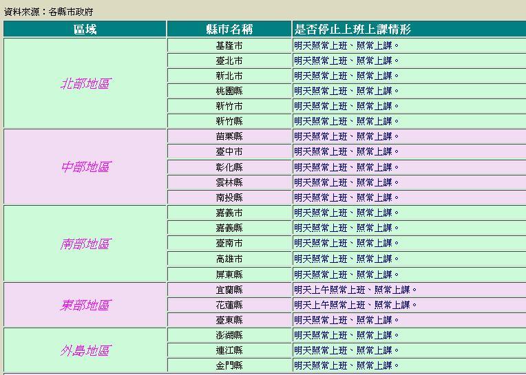 臺北巿 明天照常上班、照常上課。