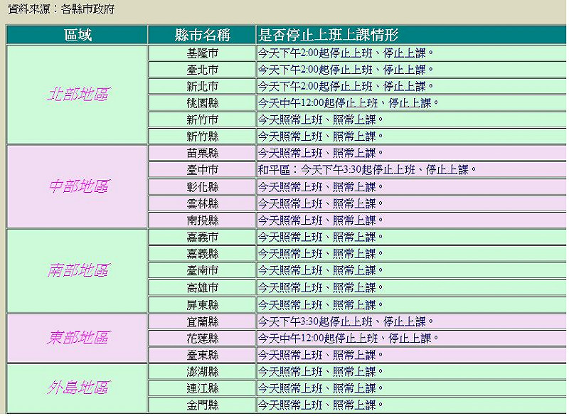 今(12)天各縣市上班上課情形。圖片來源:翻攝自人事行政總處網站。