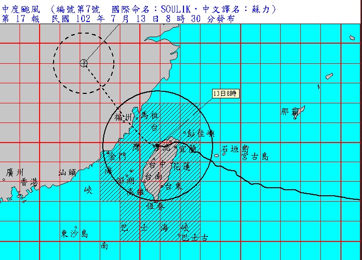 中央氣象局今(13)日表示,中度颱風蘇力的中心清晨3點在新北市與宜蘭縣交界處登陸,登陸後中心略往南移,上午8點左右已從新竹一帶出海,雖然「蘇力」的強度受到地形影響,有逐漸減弱的趨勢,但暴風圈正籠罩全台灣,民眾仍應提高警覺。
