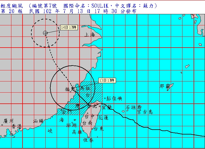 中央氣象局今(13)日傍晚5點30分已解除輕度颱風蘇力台灣本島的陸上颱風警報。根據氣象局的資料顯示,目前台灣本島、澎湖等地皆已脫離蘇力的暴風圈,蘇力颱風持續以每小時25公里的速度,朝北北西的方向前進,颱風中心已於下午4點左右登陸中國福建省,目前位於馬祖的西北西方約50公里處,金門、馬祖等地仍須提高警覺。