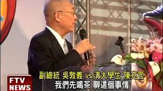 副總統吳敦義今(26)天出席第53屆全國中小學科學展覽會閉幕典禮,被站在對面2樓看台、聲援大埔的清大社研所碩士生陳亮言嗆聲,要其為大埔事件道歉、負責。吳敦義回應,歡迎陳亮言跟他約時間泡茶聊天,但陳生認為吳該聊的對象是大埔居民和農陣,而不是他,因此拒絕。