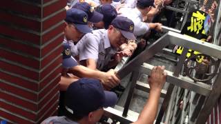 來自各方的民間團體熬著酷暑,今(2)日上午集結在立法院正門,呼籲政府立即打消核四公投案。各團體代表輪流發言、100多位民眾揮汗抗議,可謂聲勢浩大,更一度向立院投擲水球,引發短暫緊張氣氛。隨後,以公投護台灣聯盟總召蔡丁貴為首,率眾推擠立院鐵門,要求進入議場旁聽,警力則在鐵門另一面阻擋、對峙,儘管目前衝突暫歇,但隨時可能爆發第2波攻勢。