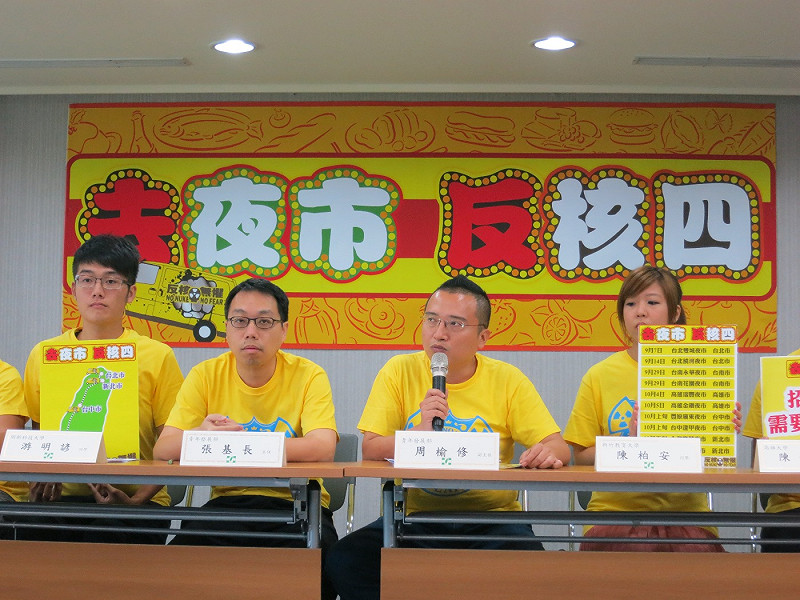 民進黨青年部今日上午召開「去夜市 反核四」記者會。周榆修說,他們將利用未來幾週的週末,走遍5都10個夜市,搭配反核胖卡、結合學生發送反核潮扇,到夜市宣傳反核四的重要性,首場將在7日晚間,於台北市雙城夜市舉辦,屆時黨主席蘇貞昌也會出席。